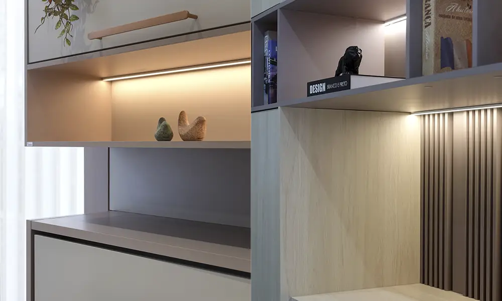 Nos móveis planejados, essa integração começa na estrutura. Perfis de LED embutidos em painéis e prateleiras criam iluminação indireta contínua, eliminando pontos de sombra e valorizando texturas. Em cozinhas planejadas, a iluminação linear sob armários superiores melhora a visibilidade da bancada sem interferir na composição estética. Já sistemas de iluminação interna em gavetas profundas ou despensas facilitam o uso diário e reduzem a necessidade de luz geral intensa.